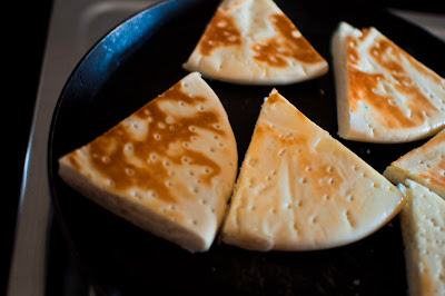 Erm, almost done, save the makeshift non-pita bread. Which in our case was actually store-bought pizza base, which i cut into wedges, slathered with butter and toasted on the tawa till golden brown.
